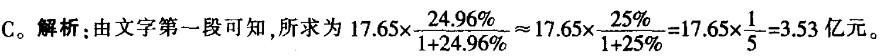 问题 2012年9月30日~10月7日中秋、国庆黄金周期间,全国纳入监测的119个直报景区点共接待游客3424.56万人次,同比增长20.96%;旅游收入17.65亿元,同比增长24.96%。 9月29日至10月6日,民航全国累计发送559?班次,运送旅客人数760.71万人次;铁路全国累计发送旅客6095万人次,同比增长9.4%。 据统计,2012年中秋、国庆黄金周,接待人次约为3.62亿,较去年同比增长20%。旅游收入约为1800亿元人民币,比上年同期增长24%。 2012年中秋、国庆黄金周期间,全国纳入监测的119个直报景区点旅游收入比上年同期增加多少亿元? A.2.97 B.3.12 C.3.53 D.3.65