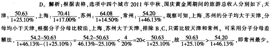 问题 2012年9月30日~10月7日中秋、国庆黄金周期间,全国纳入监测的119个直报景区点共接待游客3424.56万人次,同比增长20.96%;旅游收入17.65亿元,同比增长24.96%。 9月29日至10月6日,民航全国累计发送559?班次,运送旅客人数760.71万人次;铁路全国累计发送旅客6095万人次,同比增长9.4%。 据统计,2012年中秋、国庆黄金周,接待人次约为3.62亿,较去年同比增长20%。旅游收入约为1800亿元人民币,比上年同期增长24%。 下列城市中,2011年中秋、国庆黄金周期间旅游总收入最少的是: A.天津 B.上海 C.苏州 D.常州