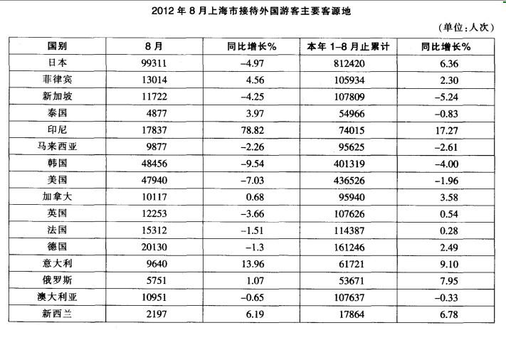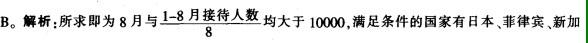 问题 上海市接待外国游客主要客源地国家中,2012年8月与1-8月月均游客数都超过 1_人的国家有()个。 A.8 B.10 C.ll D.16