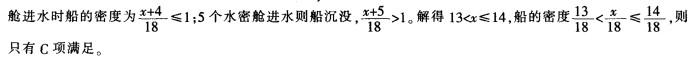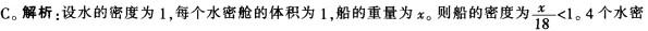 问题 泰坦尼克号设计有16个水密舱,若进水的水密舱不超过4个,则船不会沉没。根据浮力定律可知,船的密度低于水的密度时才能浮起来。那么船的密度与水密度之比可能是多少?(船的总体积相当于18个水密舱) A.0.6 B. 0.7 C.0.76 D.0.82