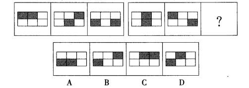 解析 每个图形都由六个方格组成,其中两个方格含有阴影,每组三个图形的阴影正好组成一个完整的长方形,由此选择B项。