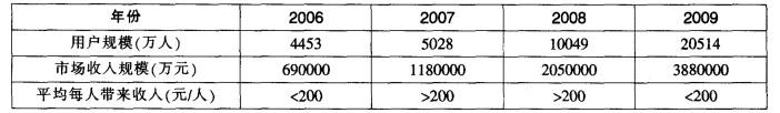 解析 将2006-2009年的数据列表如下: 但2008年用户规模大约是2007年的2倍,市场收人规模却明显小于2007年的2倍,故平均带来的收人应低于2007年,因此2007年最高。
