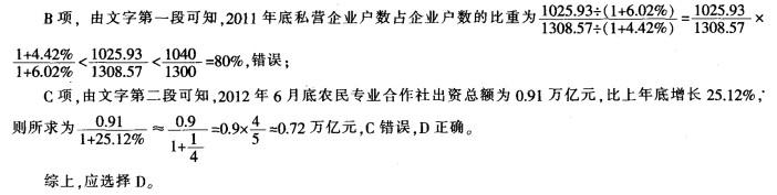 解析 A项,由文字第一、二段可知,2012年6月底,全国市场主体实有户数为.1308.57+ 3896.07+60.01=5264.65 万户,错误;