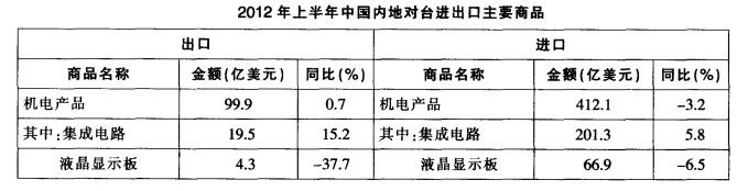 根据以下资料,回答问题。2012年上半年,中国内地对台湾地区出口机电产品99.9亿美元,同比增长0.7%,占同期内地对台湾地区出口总值的79.6% ;...