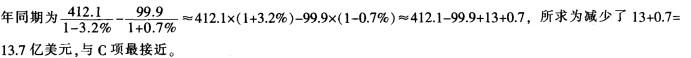 问题 根据以下资料,回答问题。 2012年上半年,中国内地对台湾地区出口机电产品99.9亿美元,同比增长0.7%,占同期内地对台湾地区出口总值的79.6% ;自台进口机电产品412.1亿美元,同比下降3.2%,占同期内地自台进口总值的84.2%。 与上年同期相比,2012年上半年内地对台湾地区进出口机电产品的逆差额: A.增加了 14.3亿美元 B.增加了 34.5亿美元 C.减少了 14.3亿美元 D.减少了 34.5亿美元