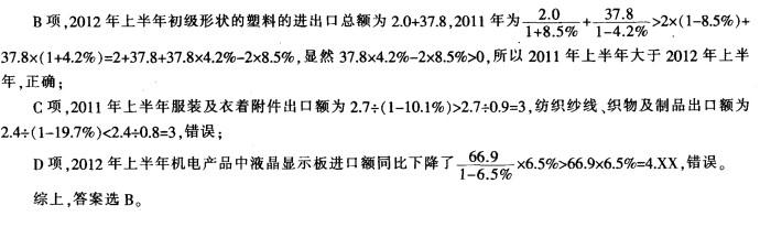 问题 根据以下资料,回答问题。 2012年上半年,中国内地对台湾地区出口机电产品99.9亿美元,同比增长0.7%,占同期内地对台湾地区出口总值的79.6% ;自台进口机电产品412.1亿美元,同比下降3.2%,占同期内地自台进口总值的84.2%。 关于中国内地对台进出口主要商品,下列说法正确的是: A.2011年上半年,钢材出口金额与进口金额相同 B.2012年上半年,初级形状的塑料的进出口总额有所下降 C.2011年上半年,服装及衣着附件与纺织纱线、织物及制品出口额相同 D.2012年上半年,机电产品中液晶显示板进口额同比下降了不到4亿美元