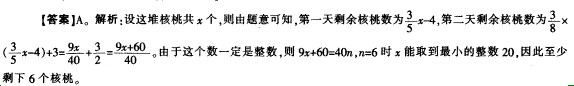 问题 海滩上有一堆核桃,第一天猴子吃掉了这堆核桃的五分之二,又扔掉4个到大海中去,第二天吃掉的核桃数再加上3个就是第一天所剩核桃的八分之五,那么这堆核桃至少剩下多少个? A.6 B.8 C.10 D.12