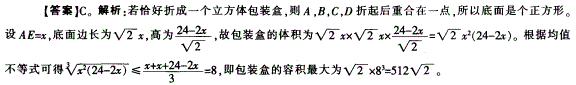 如图所示,在边长为24的正方形ABCD上,减去阴影部分四个全等的等腰直角三角形,再沿虚线折起,恰好折成一个立方体包装盒。 这个包装盒容积最大为: