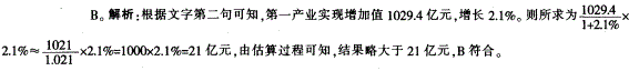 问题 2012年1~3季度,浙江省实现地区生产总值24214.9亿元,比上年同期增长7.7%,增速比 1-2季度加快0.3个百分点。其中,第一产业实现增加值1029.4亿元,增长2.1%;第二产业实现 增加值12269.0亿元,增长6.8%;第三产业实现增加值10916.5亿元,增长9.2%。 2012年1?3季度,浙江省第一产业增加值比上年同期增加()亿元。 A.20.8 B.21.2 C.22.3 D.23.7