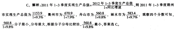 问题 2012年1~3季度,浙江省实现地区生产总值24214.9亿元,比上年同期增长7.7%,增速比 1-2季度加快0.3个百分点。其中,第一产业实现增加值1029.4亿元,增长2.1%;第二产业实现 增加值12269.0亿元,增长6.8%;第三产业实现增加值10916.5亿元,增长9.2%。 2011年1~3季度,浙江省实现生产总值最少的是()市。 A.湖州 B.衢州 C.舟山 D.丽水