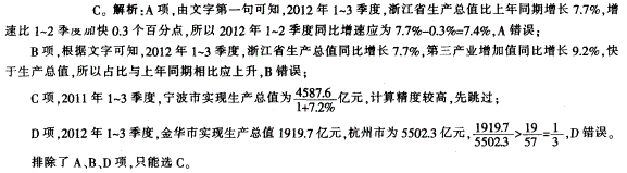 问题 2012年1~3季度,浙江省实现地区生产总值24214.9亿元,比上年同期增长7.7%,增速比 1-2季度加快0.3个百分点。其中,第一产业实现增加值1029.4亿元,增长2.1%;第二产业实现 增加值12269.0亿元,增长6.8%;第三产业实现增加值10916.5亿元,增长9.2%。 下列说法正确的是: A.2012年上半年,浙江省实现地区生产总值同比增长8.0% B.2012年1~3季度,浙江省第三产业增加值占地区生产总值的比重较上年同期下降1.5个百分点 C.2011年1~3季度,宁波市实现生产总值4279.5亿元 D.2012年1~3季度,金华市实现生产总值不足杭州市的三分之