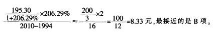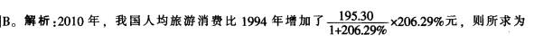 问题 2011年,我国旅游业三大市场继续保持较快增长。全国旅游业总收人225万亿元,较2010 年增长20.8%。 国内旅游人数达26.4亿人次,较2010年增长25.5% ;国内旅游收入1.93万亿元,较2010 年增长23.6%。1994年到2010年,我国居民出游人数及出游率增长较快,城镇居民旅游人次从 2.05亿人次,增长到10.65亿人次;农村居民旅游人次从3.19亿人次,增长到10.38亿人次。 2010年,我国人均旅游消费195.30元,较1994年增长了 206.29%。 入境旅游人数1.35亿人次,较2010年增长1%,1994年来华旅游人境人数仅4368万人次; 入境过夜旅游人数5758万人次,较2010年增长3.5%;入境旅游外汇收入484.6亿美元,较2010 年增长5.8%,1994年旅游外汇收入仅73亿美元。 出境旅游人数6900万人次,较2010年增长20.2%,比2000年增长了约470%。 1994~2010年,我国人均旅游消费年均增长()元。 A.7.8 B.8.2 C.9.5 D.10.4