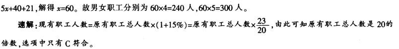 问题 某公司男女职工比例为4:5,因为业务扩张,预计员工总数需要增加15%。在第一轮招 聘工作结束后,男职工增加了1/12,女职工增加了 40人,人力资源总监宣布第二轮招聘工作再增加21名员工即可达成年度招聘目标。请问公司原有男女职工各多少人? A.200,250 B.300,375 C.240,300 D.360,450