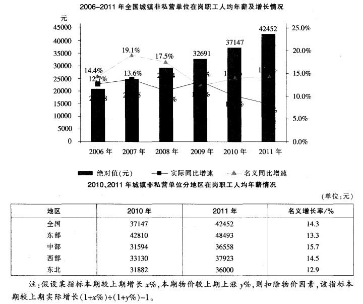 根据以下资料,回答问题。 2011年全国城镇非私营单位在岗职工人均年薪为42杉2元,与2010年的37147元相比, 增加了 5305元,同比名义增长...