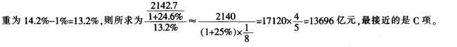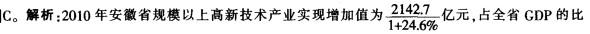 问题 根据以下资料,回答问题。 2011年安徽省规模以上高新技术产业实现产值8330.3亿元,比上年同期增长46.5%;实现 增加值2142.7亿元,同比增长24.6%,占全省GDP的比重14.2%,比上年提高1个百分点;实 现新产品产值1592.9亿元,比上年同期增长37.3%。 合芜蚌自主创新试验区规模以上高新技术产业实现产值5284.4亿元,比上年增长45.4%; 实现增加值1324.7亿元,比上年增长25.6%。 2011年,光机电领域实现增加值949.2亿元,新材料领域实现增加值637.6亿元,生物医药 领域实现增加值150.3亿元,电子信息领域实现增加值191.4亿元,新能源与高效节能领域实 现增加值174.3亿元,髙新技术服务业实现增加值39.9亿元。 2011年,全省1335家高新技术企业实现产值6163.7亿元,当年申请专利14183项,占全 省专利申请总数的M.2%,当年授权专利8807项,占全省专利授权总数的26.9%。其中,营业总 收入亿元以上的高新技术企业551家,10亿元以上的83家,国家重点高新技术企业73家,上 市高新技术企业54家。 2010年安徽省全省GDP()亿元。 A. 15089.4 B.21203.7 C.13027.7 D.无法计算