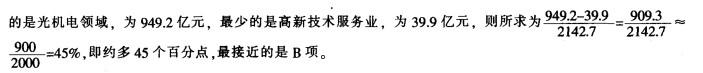 问题 根据以下资料,回答问题。 2011年安徽省规模以上高新技术产业实现产值8330.3亿元,比上年同期增长46.5%;实现 增加值2142.7亿元,同比增长24.6%,占全省GDP的比重14.2%,比上年提高1个百分点;实 现新产品产值1592.9亿元,比上年同期增长37.3%。 合芜蚌自主创新试验区规模以上高新技术产业实现产值5284.4亿元,比上年增长45.4%; 实现增加值1324.7亿元,比上年增长25.6%。 2011年,光机电领域实现增加值949.2亿元,新材料领域实现增加值637.6亿元,生物医药 领域实现增加值150.3亿元,电子信息领域实现增加值191.4亿元,新能源与高效节能领域实 现增加值174.3亿元,髙新技术服务业实现增加值39.9亿元。 2011年,全省1335家高新技术企业实现产值6163.7亿元,当年申请专利14183项,占全 省专利申请总数的M.2%,当年授权专利8807项,占全省专利授权总数的26.9%。其中,营业总 收入亿元以上的高新技术企业551家,10亿元以上的83家,国家重点高新技术企业73家,上 市高新技术企业54家。 2011年,安徽省规模以上高新技术产业中实现增加值最多的领域占总增加值的比重比最少的多()个百分点。 A.29.6 B.42.4 C.32.7 D.10.9