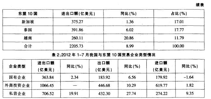 解析 根据表1,2012年1-7月我国对东盟10国的进出口总额为2205.73亿美元,同比增长