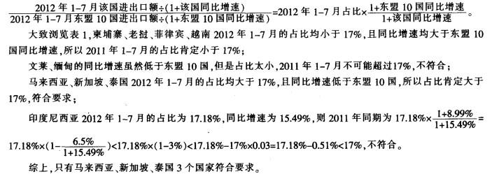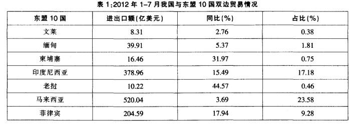 解析 根据表1,2011年1-7月各个国家进出口总额占东盟10国的比重为