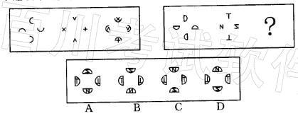 解析 本题考查位置类中的旋转,第一幅图形中的四个元素按逆时针方向平移一个位置,第二幅图形中的四个元素按顺时针方向平移一个位置,然后进行叠加得出第三幅图形。在第二组图形中,按照上述规律,得出本题答案为D。 [拓展]位置类一直是近年国考中的热点,但是在位置类的知识点中,不仅只有旋转一种,还会有平移和翻转,所以在之后的考试中,很有可能会将这些知识点融合。