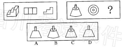 解析 本题考查的是图形中的俯视图和侧视图,第一组图形中的第二幅图是第一幅的俯视图,第三幅是第一幅的侧视图。第二组图形中,按照上述规律,得出本题答案为D。 [拓展]从各个角度来看图形,不仅有俯视图和侧视图,还会包括主视图、左视图、仰视图等,这些知识点需要考生多积累,以防之后还会从这几个角度做文章。