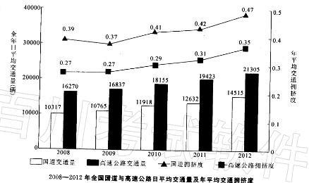问题 2012年全国国道网车流量较大的地区主要集中在北京、天津、上海、江苏、浙江、广东和山东,上述省市国道网的日平均交通量均超过2万辆。全国国道网日平均行驶量为244883万车公里,北京、天津、河北、山西、上海、浙江、湖北、广东的国道年平均拥挤度均超过0. 6。其中,国家髙速公路日平均交通量为22181辆,日平均行驶量为148742万车公里;普通国道日平均交通量为10845辆,日平均行驶量为111164万车公里。全国高速公路日平均交通量为21305 辆,日平均行驶量为204717万车公里。(注:交通拥挤度指公路上某一路段折算交通量与适应交通量的比值,反映交通的繁忙程度。) 以下关于2012年日平均行驶量由髙到低排序正确的是( )。 A.国家高速公路-全国高速公路-普通国道 B.全国高速公路-国家高速公路-全国国道网 C.全国国道网-普通国道-国家高速公路 D.全国国道网-国家髙速公路-普通国道