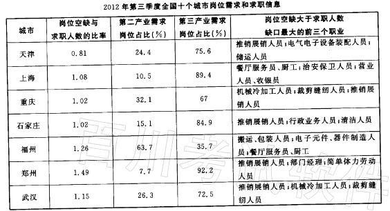 解析 根据表格中数据,第三产业需求岗位数超过第二产业2倍的城市共有:天津、上海、重庆、石家庄、郑州、武汉6个。因此,本题答案为D选项。