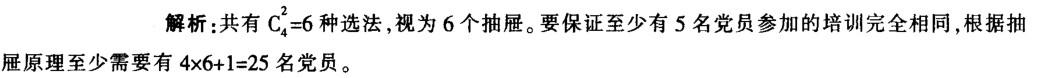 问题 某单位组织党员参加党史、党风廉政建设,科学发展观和业务能力四项培训,要求每名党员参加且只参加其中的两项。无论如何安排,都有至少5名党员参加的培训完全相同,问该单位至少有多少名党员? A.17 B.21 C.25 D.29
