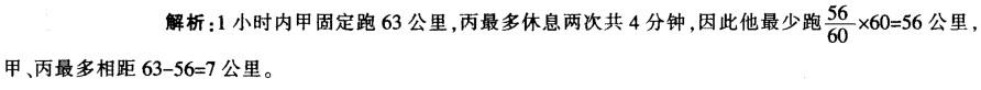 问题 公路上有三辆同向行驶的汽车,其中甲车的时速为63公里,乙、丙两车的时速均为60公里,但由于水箱故障,丙车每连续行驶30分钟后必须停车2分钟。甲上10点,三车到达同一位置,问1小时后,甲、丙两车最多相距多少公里? A.5 B.7 C.9 D.11