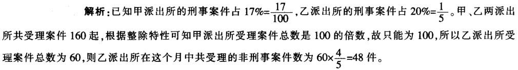 问题 两个派出所某月内共受理案件160起,其中甲派出所受理的案件中有17%是刑事案件,乙派出所受理的案件中有20%是刑事案件,问乙派出所在这个月中共受理多少起非刑事案件? A.48 B.60 C.72 D.96