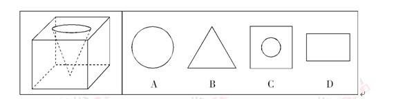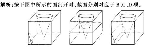 问题 一立方体如图所示从中挖掉一个圆锥体,然后从任意面剖开,下面哪一项不可能是该立方体的截面?
