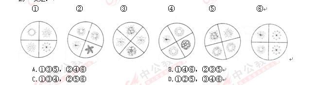 解析 每个图形的封闭区域中都含有4个小图形,其中有两个小图形相同。①③④中相同的两个小图形相对,②⑤⑥中相同的两个小图形相邻。