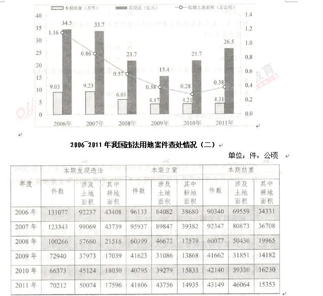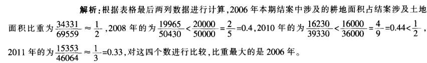 问题 2011年发现违法用地行为7.0万件,涉及土地5.0万公顷(耕地1.8万公顷),同比分别上升5.8%、11.0%(耕地下降2.4%)。立案查处违法用地案件4.2万件,涉及土地4.4万公顷(耕地1.5万公顷),同比分别上升2.5%、11.4%(耕地下降5.7%)。依法拆除违法构建物1289.8万平方米,收回土地3791.2公顷(耕地1064.7公顷),罚没款26.5亿元。 2006~2011年我国违法用地案件查处情况(一) 下列年份中,本期结案中涉及的耕地面积占结案涉及土地面积比重最高的是: A.2006年 B.2008年 C.2010年 D.2011年