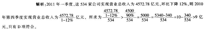 问题 截至2011年4月21日22时,沪深两市已有534家上市公司公布第一季度财报。这534家公司实现营业总收入4572.78亿元,同比增长30.74%;实现净利润336.7亿元,同比增长30.52%。不过,一季度销售收入和净利润环比则有所下降,其中营业总收入环比下降12%,净利润环比下降25%,这534家公司2011年一季度存货6167.68亿元,较上年年末增长10%。 25家已公布一季报的房地产公司一季度实现营业收入193.68亿元,同比增长9%;实现净利润29.97亿元,同比增长31%;存货2892.18亿元,同比增长10%。 已公布一季报的6家钢铁板块公司一季度存货为322亿元,实现营业收入493.39亿元,同比略有降低,环比下降20%;实现净利润12.65亿元,同比增长62%,环比表现更好,这6家公司2010年四季度净亏损3.77亿元。 建筑机械类公司持续了之前的景气度,有4家公司公布一季报,实现营业总收入15.90亿元,同比增长39%;实现净利润1.18亿元,同比增长47.5%。 已公布一季报的534家公司,平均每家在2010年第四季度实现营业收入约多少亿元? A.0.63 B.7.54 C.8.56 D.9.73