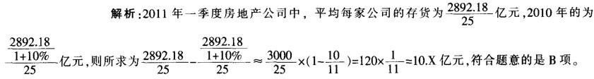 问题 截至2011年4月21日22时,沪深两市已有534家上市公司公布第一季度财报。这534家公司实现营业总收入4572.78亿元,同比增长30.74%;实现净利润336.7亿元,同比增长30.52%。不过,一季度销售收入和净利润环比则有所下降,其中营业总收入环比下降12%,净利润环比下降25%,这534家公司2011年一季度存货6167.68亿元,较上年年末增长10%。 25家已公布一季报的房地产公司一季度实现营业收入193.68亿元,同比增长9%;实现净利润29.97亿元,同比增长31%;存货2892.18亿元,同比增长10%。 已公布一季报的6家钢铁板块公司一季度存货为322亿元,实现营业收入493.39亿元,同比略有降低,环比下降20%;实现净利润12.65亿元,同比增长62%,环比表现更好,这6家公司2010年四季度净亏损3.77亿元。 建筑机械类公司持续了之前的景气度,有4家公司公布一季报,实现营业总收入15.90亿元,同比增长39%;实现净利润1.18亿元,同比增长47.5%。 已公布2011年一季报的房地产公司中,平均每家公司的存货比上年同期增长了约多少亿元? A.5 B.11 C.51 D.105