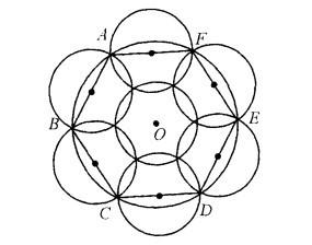 解析 由于每个小圓(喷头浇灌范围)的直径为10,所以每个小圓至多盖住圓心角为60度相 应的大圓(花坛)弧长,所以想盖住整个圓周,需要至少六个小圓,当且仅当这六个小圓以大圓的内接正六边形 各达中点为圓心,但此时大圓的圓心未被盖住,所以至少需要七个圓.下面构造的图纸证明,七个圓是可 以的: