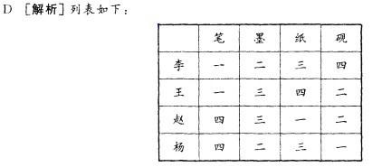 解析 从赵、杨入手,小赵一个也没猜对,因此小杨的第四层猜错。又知小杨猜对两个,小李猜对一个,而小李的 第二层与第三层和小杨猜的相同,因此这两层中只能有一个正确,故小杨第一层猜对,即砚在第一层t至此, 已可选出正确答案。再往下看,第一层不是笔,第二层不是砚,若小杨猜的第三层正确,那么小王就一个也没 猜对,排除。则小杨猜的第二层正确,即第二层是墨,则小王猜的第四层正确,是纸。笔、墨、纸、砚分别在第三 层,第二层、第四层、第一层。本题正确答案为D。