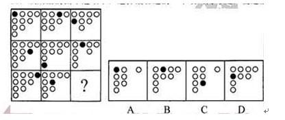 解析 每行的白圈个数分别为9、8、7,排除掉B项、D项。小黑圆圈每次依着向右,右边无圆圈则向下的顺序每次移动两格(下幅图中被消去的小白圆圈不计算在移动格子内),所以符合条件的只有C项。