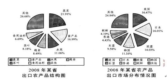 2008年,某省农产品进出口贸易总额为7.15亿美元,比上年增长25.2%。其中。出口额为5.02亿美元,增长22.1%;进口额为2.13亿美元。增长33...