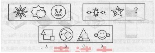 解析 第一套图形,由内外两个图形组成,且两个图形形状相似。第二套图形,每一个都由相同的三个图形组成,且有两个图形对称,因此选D。