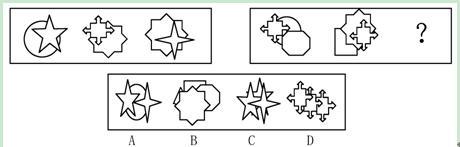 解析 由第一组图可以知道,每个图形都是由互不相同的两个图形组成的,而第二组图中的前两个图形都是由三个不同图案重叠而成,所以第三个图形也应该是有三个不同图案重叠而成的,由此可以排除B、C、D。