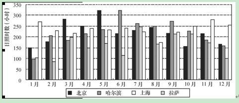 2003年部分城市日照时数针对上图日照数据,下面说法不正确的是( )。A.拉萨日照最高月份的日照时数少于哈尔滨最高月份的日照时数B.上海6...