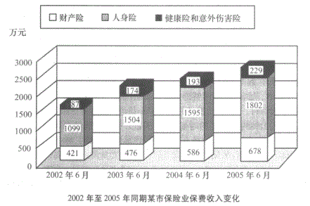 2003年6月,该市哪一种保险的保费收人占总保费收入的比重相对2002年6月有最大增长?( )A.财产险B.人身险C.健康险和意外伤害险 ...
