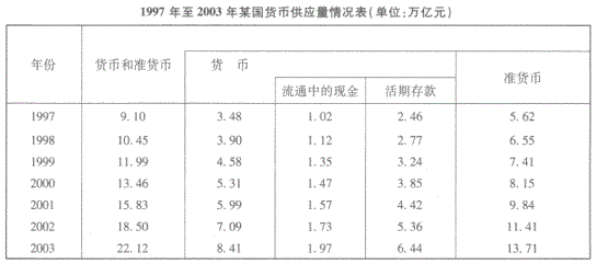 问题 根据上表所列数据,下列说法不正确的是( )。 A.并不是每一年,准货币都超过活期存款 B.2000年活期存款是流通中的现金的2.5倍以上 C.与1997年相比,2003年活期存款占货币量的比例有所增加 D.准货币在货币和准货币中的比例均高于货币在货币和准货币中的比例