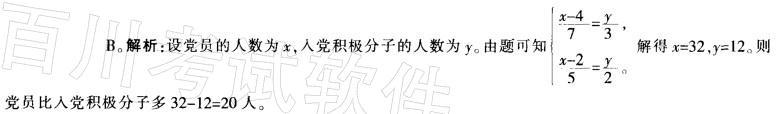 问题 某单位组织参加理论学习的党员和入党积极分子进行分组讨论,如果每组分配7名党员和3名入党积极分子,则还剩下4名党员未安排。如果每组分配5名党员和2名入党积极分子,则还剩下2名党员未安排。问参加理论学习的党员比入党积极分子多多少人? A.16 B.20 C.24 D.28