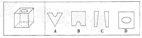 问题 左边的立体图形是立方体中挖出一个圆锥台孔后形成的,如果从任一面剖开,以下哪一个不可能是该立体图形的截面?