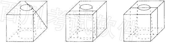 左边的立体图形是立方体中挖出一个圆锥台孔后形成的,如果从任一面剖开,以下哪一个不可能是该立体图形的截面?