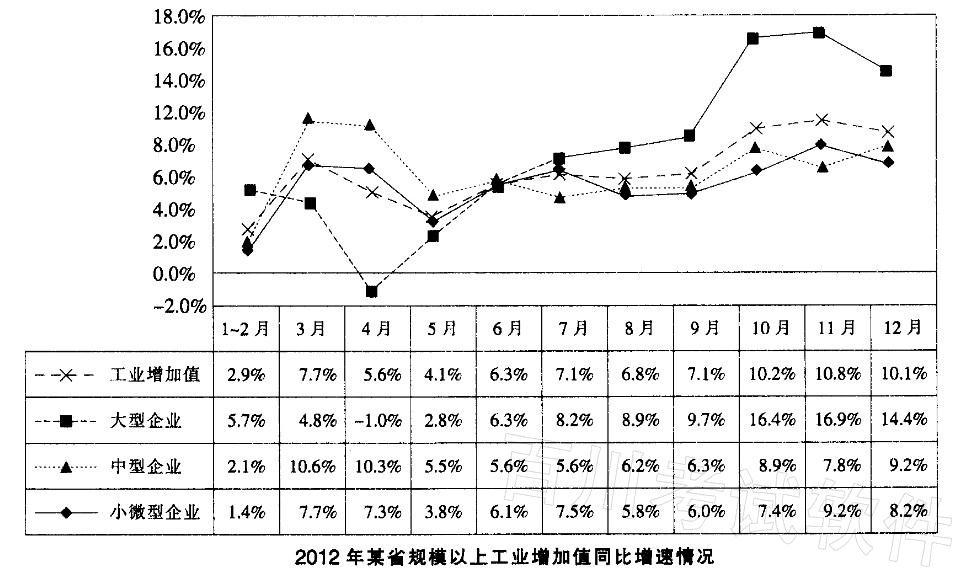 2012年,某省规模以上工业增加值10875亿元,比上年增长7.1%,月度增速从1~2月的2.9%回升到10~12月的10%以上。大型、中型和小微型企业增...