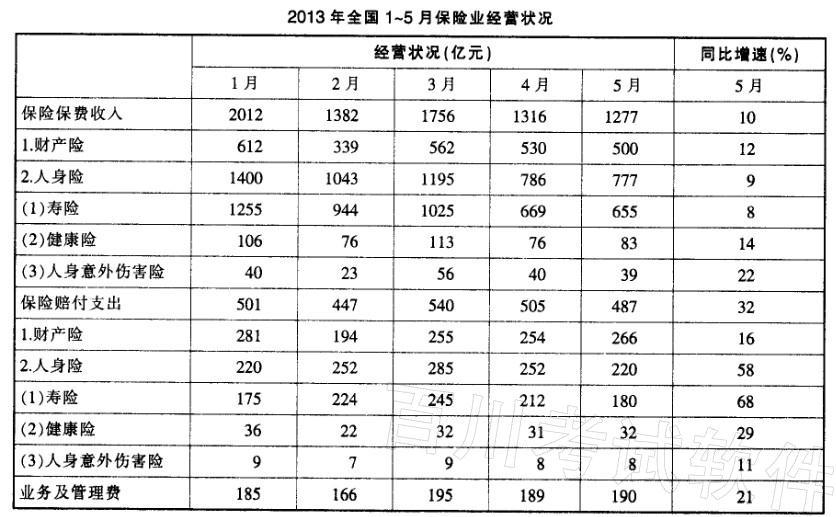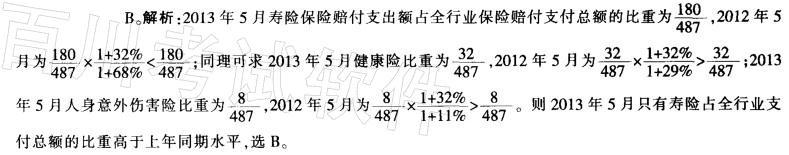 在寿险、健康险和人身意外伤害险中,有几类险种在2013年5月的保险赔付支出额占全行业保险赔付支出总额的比重高于上年同期水平?A.0 B.1 C...