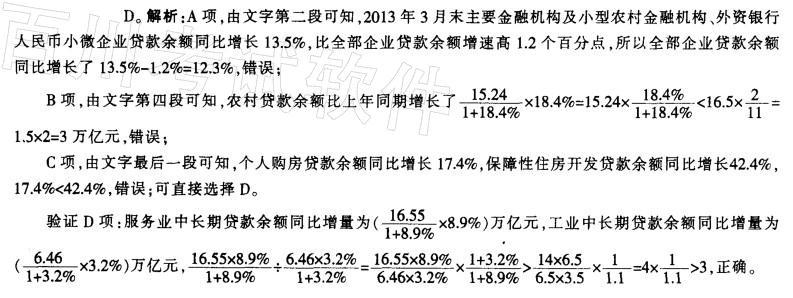 问题 2013年3月末,金融机构人民币各项贷款余额65.76万亿元,同比增长14.9%,增速比上年同期低0.8个百分点。 2013年3月末,主要金融机构及小型农村金融机构、外资银行人民币小微企业贷款余额11.78万亿元,同比增长13.5%,比全部企业贷款余额增速高1.2个百分点。 2013年3月末,主要金融机构本外币工业中长期贷款余额6.46万亿元,同比增长3.2%。其中,轻工业中长期贷款余额6824亿元,同比增长7.6%;重工业中长期贷款余额5.77万亿元,同比增长2.7%。服务业中长期贷款余额16.55万亿元,同比增长8.9%。 2013年3月末,主要金融机构及小型农村金融机构、村镇银行、财务公司本外币农村贷款余额15.24万亿元,同比增长18.4%;农户贷款余额3.86万亿元,同比增长16.9%;农业贷款余额2.87万亿元,同比增长12.3%0 2013年3月末,主要金融机构及小型农村金融机构、外资银行人民币房地产贷款余额12.98万亿元,同比增长16.4%。地产开发贷款余额1.04万亿元,同比增长21.4%。房产开发贷款余额3.2万亿元,同比增长12.3%。个人购房贷款余额8.57万亿元,同比增长17.4%。保障性住房开发贷款余额6140亿元,同比增长42.4%。 关于2013年3月末贷款余额情况,能够从上述资料中推出的是: A.全部企业贷款余额同比增长了 14.7% B.农村贷款余额比上年同期增长了 3万多亿元 C.个人购房贷款余额同比增速快于保障性住房开发贷款余额 D.服务业中长期贷款余额同比增量超过工业中长期贷款余额的3倍
