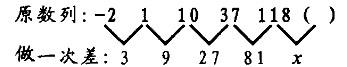 解析 本数列为二级等比数列,即 3,9,27,81,x是公比为3的等比数列,x=81x3 = 243,则空缺项为118 + 243 = 361。